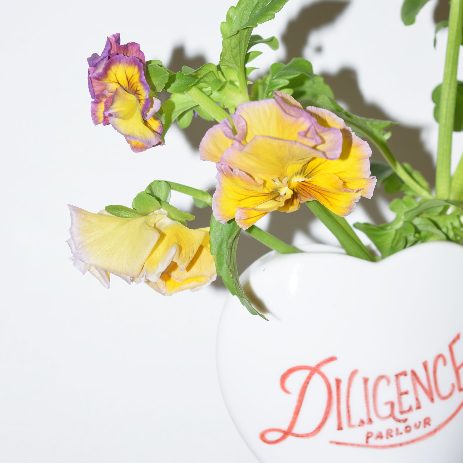 陶器製のハート花瓶に、DILIGENCE PARLOURのロゴがハンドペイントされたHeartwarming Flower Vase とパンジーのセット。